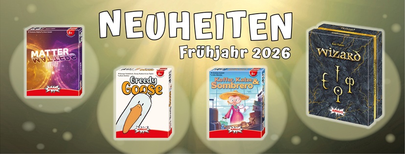 Das Spielejahr 2026 startet mit frischen Neuheiten von AMIGO. Bei allgames4you.de warten gleich mehrere spannende Titel darauf, entdeckt zu werden. Mit Greedy Goose, Koffer, Katze & Sombrero, Matter Matters und der Wizard 30 Jahre Edition gibt es im Frühjahr 2026 wieder jede Menge Spielspaß für Familien, Vielspieler und alle, die gerne neue Kartenspiele und Gesellschaftsspiele ausprobieren.